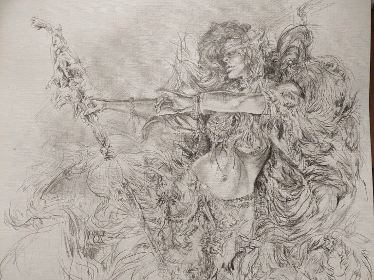 Die Welt spielt und erschafft sich Charaktere darin. Ich zeichne diese und verwirkliche dieses Sein in eine reale Zeichnung und verewige dies gern anschließend in ein Gemälde.